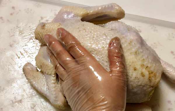 6、抹上橄欖油,鹽和黑胡椒,均勻的揉搓十分鐘左右,給雞做一個按摩,讓它更入味。