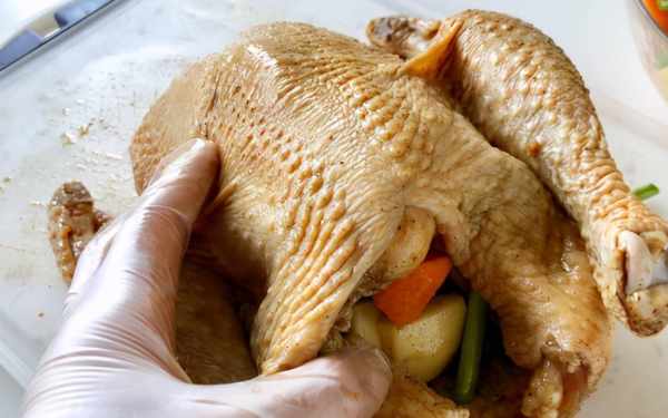 12、拿出醃制好的雞,把一部分蔬菜塞到雞肚子裡。