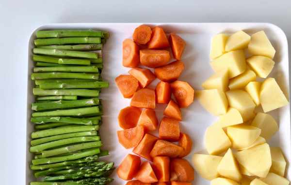 10、烤之前把蘆筍切段,胡蘿卜和土豆切成滾刀塊。