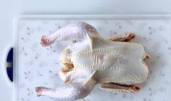 1、三黃雞掏空內臟,清洗幹凈,用菜刀剁掉雞頭,雞脖子,雞爪子和雞翅尖。