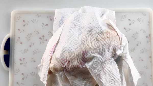 5、醃好的雞拿出來用廚房紙吸幹雞身上的水分。