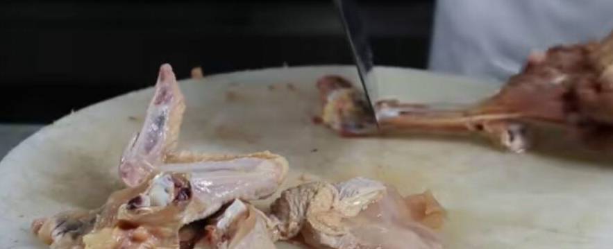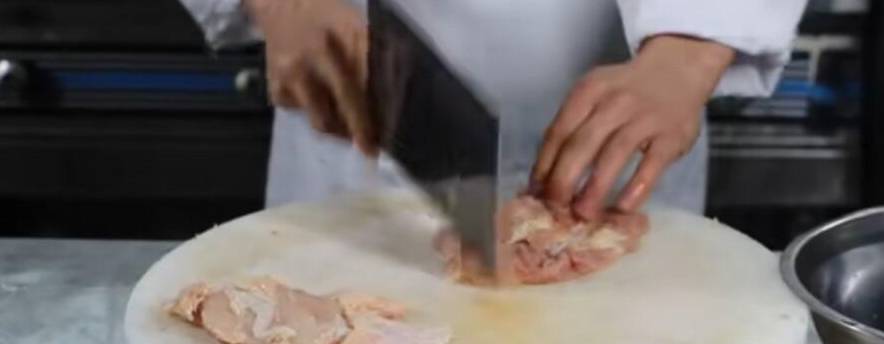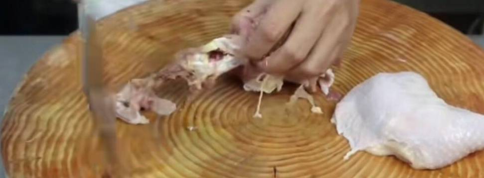 做這道菜一定要把雞肉去骨,雞的骨頭斬成小塊備用,雞肉厚的地方用刀斬一下,然後改刀成條,或者切成片兒也是可以的。
