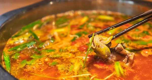 2.倒入購買的酸湯(建議凱裡紅酸湯或酸辣椒,不辣的那種),小火慢熬3-5分鐘,註意掌握火候,溫度過高會讓酸味揮發