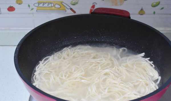 第四步炒鍋大火燒開水後,放入鹽和油,加入面條煮2分鐘,把面條焯一下水。面條焯水後倒出,放少許油,拌勻面條。面條焯水可以縮短燜面的時間,加入油拌面條,面條不會粘連在一起。