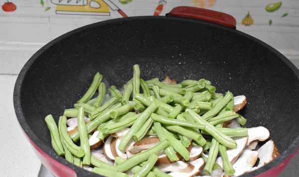 第七步加入豆角和香菇片煸炒,加入薑蓉和一半蒜蓉炒勻,把香菇炒得比較幹的狀態,
