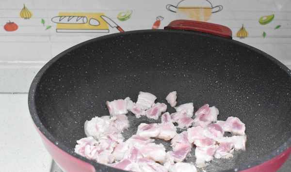 第六步炒鍋放少許油,放入五花肉香煎,五花肉兩面煎金黃。五花肉香煎過程中會出油,炒鍋不用放太多油。