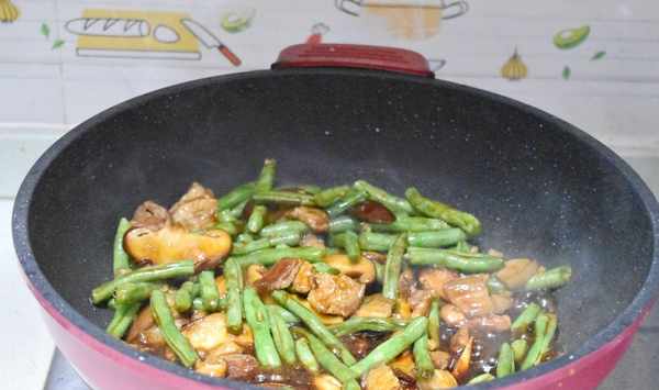 第八步加入一半調好的醬汁,把所有食材炒勻,再加入1碗水燜一下五花肉、豆角和香菇。