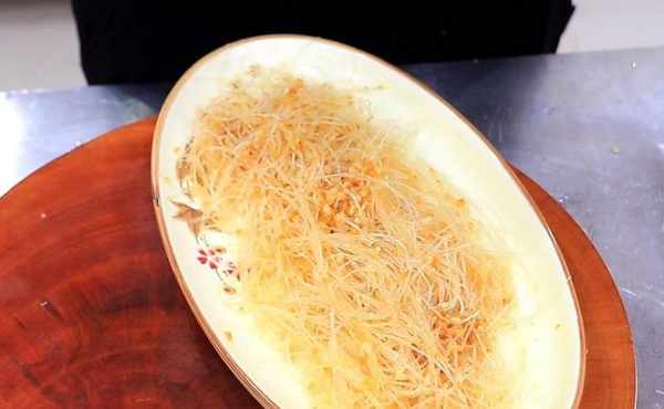 這個時候粉絲也泡軟瞭,把它剪短一些放入盆中,再倒入適量的蒜蓉醬抓拌均勻,擺放在盤中墊底。