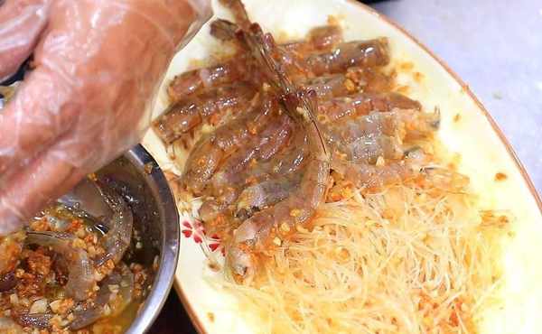 然後把蝦放在蒜蓉醬中拌勻,依次擺放在粉絲上面,撒上薑末和剩餘的蒜蓉醬。