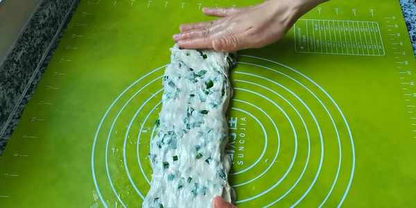 7,矽膠墊和手上都抹上一層食用油,取出面團放在矽膠墊上,整理成長方體。