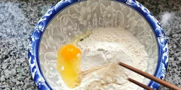 1,250克面粉中加5克白糖,2克食用鹽,3克酵母,再打入一顆雞蛋,把它攪拌均勻。