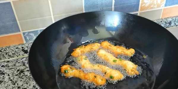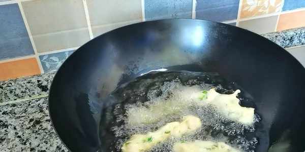 9,油燒至七成熱調中小火,放入面團,小火慢炸,中途要不停地給它翻面。