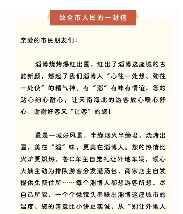 官方也明白這個道理,一封寫給淄博人的信 ,都透露出山東人骨子裡的仁義。