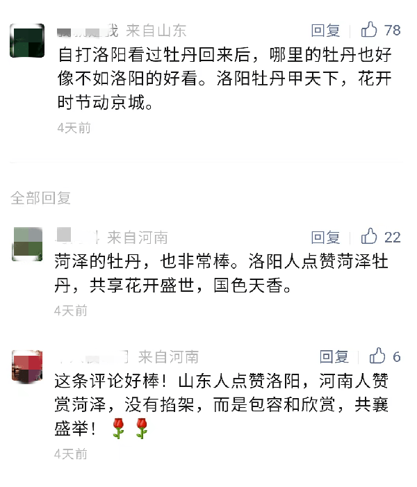 當 牡丹開瞭,兩個省之間沒有拉踩的攻擊,隻有互誇的用心。