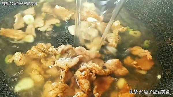 3.鍋中燒油,把肉片倒進來,炒香等顏色變白,加入一勺料酒、一勺生抽、一勺蠔油繼續翻炒,炒至上色,再把蔥薑蒜倒進來,炒出香味,然後加入一碗清水,燒開後再把豆腐倒進來,