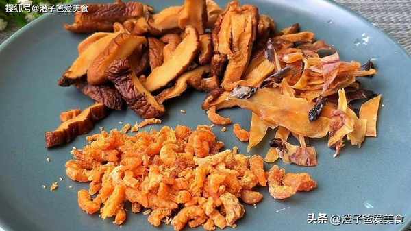 2.再準備一把蝦米,一個墨魚,洗凈後剪成小塊,沒有墨魚的可以用幹貝代替。香菇提前泡發,清洗幹凈,再擠幹水分,再用刀把它切成小塊,放盤裡備用。