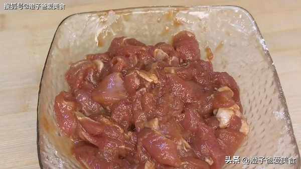 3.準備一小塊豬肉,先切成長片兒,再改刀切成長條放入碗中,倒入料酒去腥,再倒生抽、老抽、蠔油、淀粉抓拌均勻,醃制20分鐘左右,