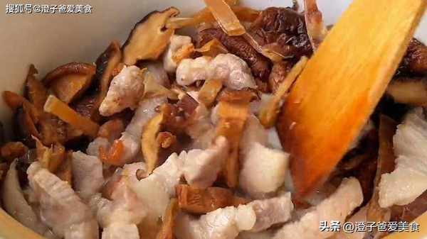 4.砂鍋裡倒入少許食用油,油熱放入五花肉煸炒,把五花肉炒至變色,炒出香味,然後倒入蝦米、香菇、墨魚,煸炒一分鐘,炒出它們的香味,再倒入一碗溫水,一勺蠔油、一小勺鹽、料酒,先把配菜盛出一半放碗裡備用,再大火把它煮開。