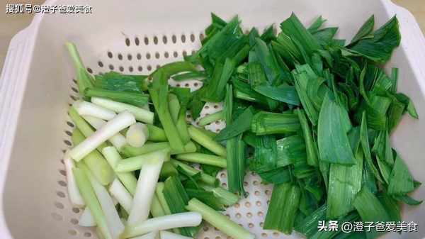 1.準備一把洗幹凈的蒜苗,斜刀切段,將蒜苗根部和葉分開,放入筐中備用,