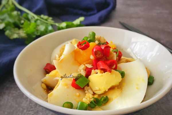4、小米椒、醬油、蒜泥、醋,攪拌成醬汁,淋在雞蛋上,撒上蔥花即可。