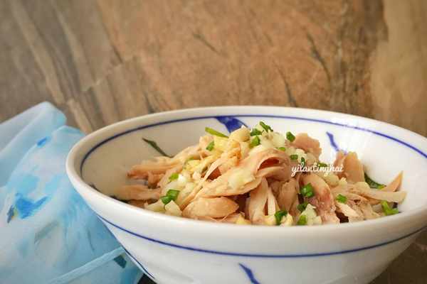 3、雞腿肉涼瞭以後,用手撕成小條放入碗中,表面放上蒜泥和蔥花。