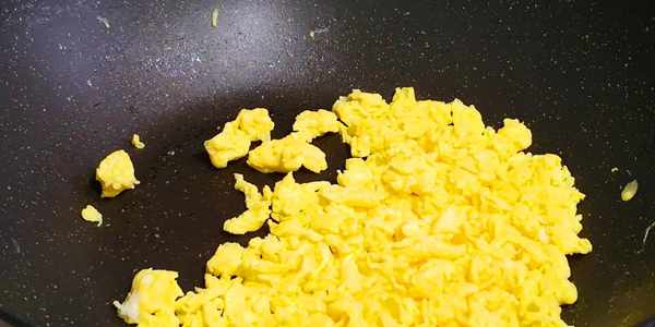 3.再準備3個雞蛋磕入碗中,打散後下鍋煎成大小均勻的雞蛋碎。取適量小蔥切成蔥花備用。