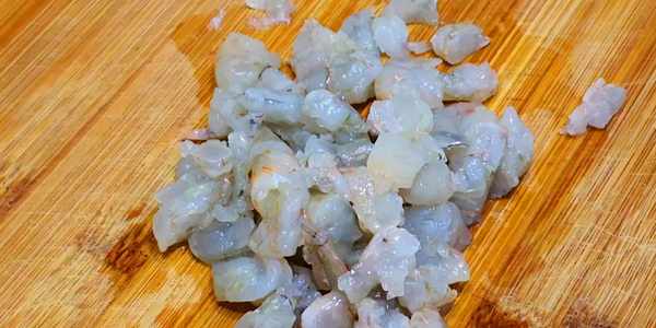 2.蝦仁可以用現成的,但我更喜歡用這種新鮮的大蝦現剝的,感覺味道更鮮美。將大蝦去掉蝦線、蝦頭和蝦殼後切成小丁,然後加入少許料酒醃制備用,料酒可以去腥。