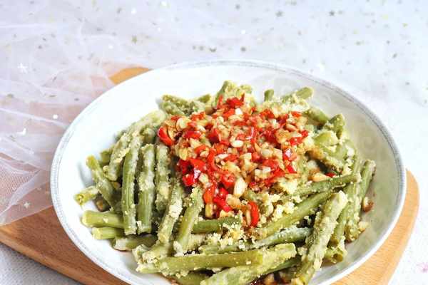 具體做法:1、豆角洗凈掐去頭尾,切成小段,大蒜、辣椒切碎末;
