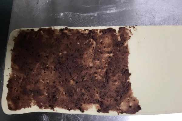 4、在搟好的長方形薄面片的二分之一處,抹上豆沙,均勻的抹均勻薄薄的一層即可,喜歡吃豆沙的,可以抹得厚點,這個隨意即可,如圖所示。
