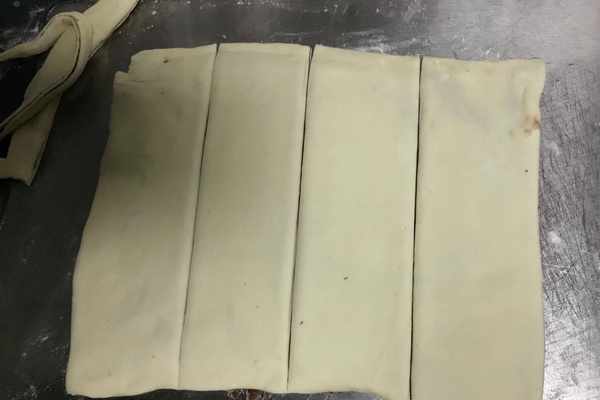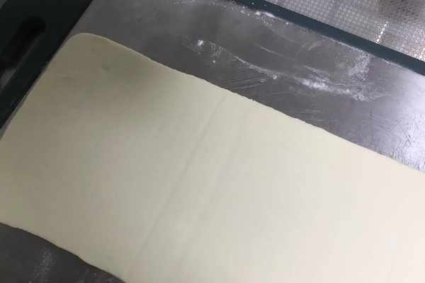3、將揉好的面團搟成一個長方形大薄片,將其整理規則些,如圖所示。