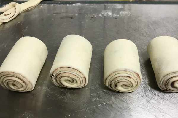 9、再來說一下第二種制作方法吧,將搟好的豆沙面片,整個卷起來後,再均勻的切成均等小段,同樣是將其放入蒸鍋中進行發酵,如圖所示。