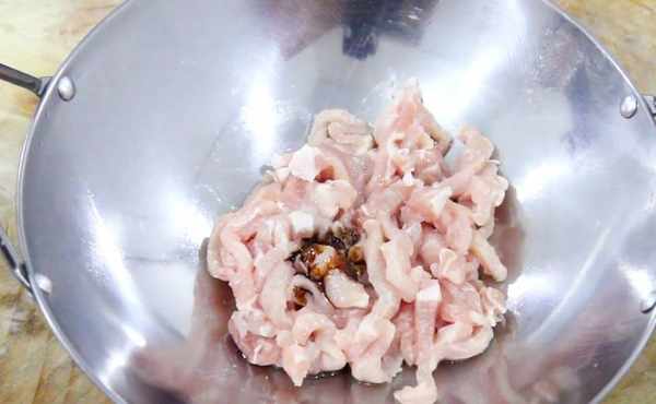加入食鹽1克、料酒5克、老抽幾滴上底色,用手抓勻讓肉絲吸收調料入味。