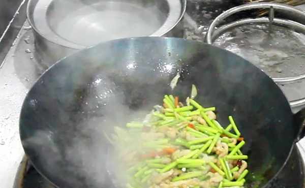 鍋內加入植物油,燒到5成熱時,油接近冒煙時慢慢抓入肉絲,開小火炸40秒左右,要是有粘連用勺子打散,倒入蒜苔再炸10秒鐘,關火一起倒出控油。