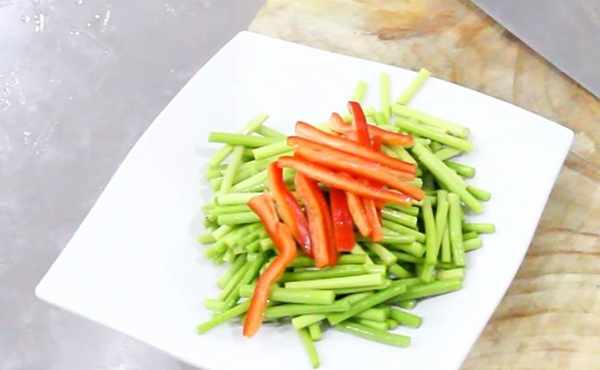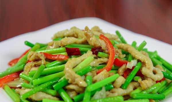 好瞭,一道美味滑嫩的蒜苔肉絲就做好瞭。