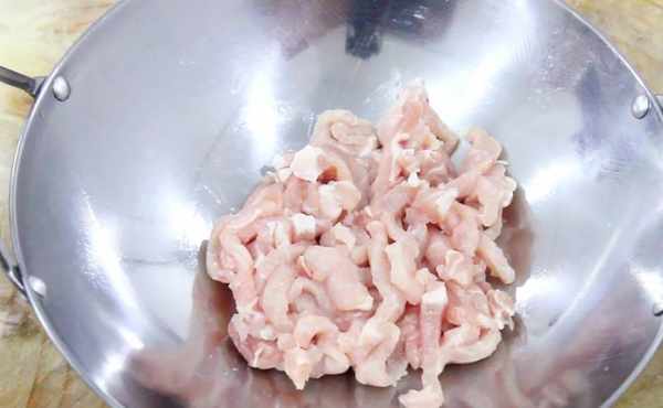 準備裡脊肉一塊,先切成片改刀成絲,放入盆中備用。