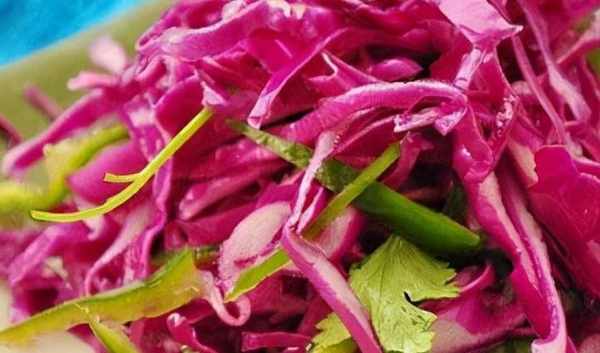 3、將青椒、甘藍洗凈,切成絲裝盤;
