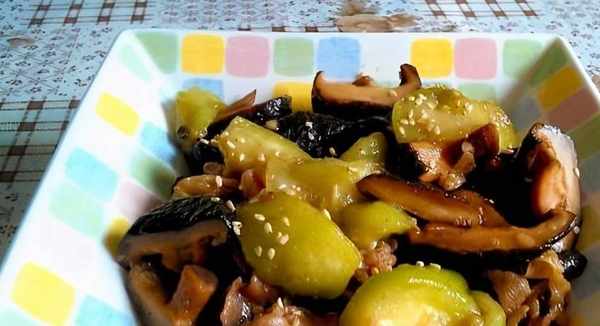 用料:絲瓜1根、香菇5朵、瘦豬肉50克、蔥花適量、泡辣椒1/2大匙、鹽1小匙、香油1小匙、雞精1/2小匙、花椒粉1/2小匙;
