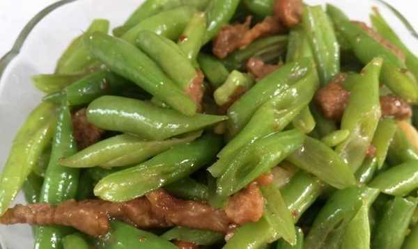 用料:豬肋條肉(五花肉)200克,四季豆150克,大蔥3克,薑3克,料酒15克,醬油25克,甜面醬3克,鹽2克,味精2克,淀粉(豌豆)8克,花生油30克,香油10克