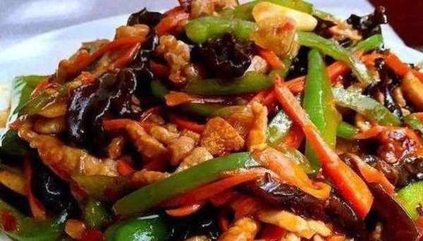 2、胡蘿卜絲炒軟後下杏鮑菇、青椒、木耳絲繼續翻炒,倒入生抽、糖、香醋、少許清水混合的調味汁翻炒,炒出水分後燉煮2分鐘,知道所有食材變軟,臨出鍋前淋水淀粉勾芡,即可