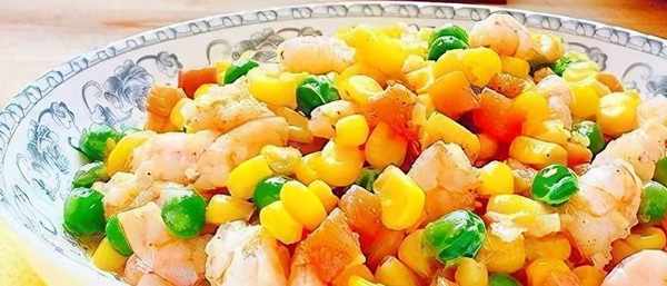 食材:蝦、胡蘿卜、豌豆、玉米粒、薑、生抽、蔥、胡椒粉、水淀粉、雞粉、料酒