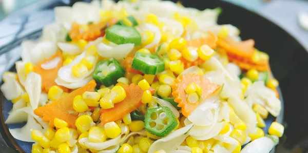 3.鍋內倒水煮開後,加鹽,焯熟玉米粒、秋葵、胡蘿卜和百合。