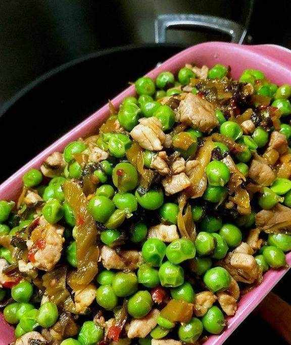 做法:1、肉切丁,酸菜切絲,鍋中油五層熱下肉丁生抽炒變色,加入青豆翻炒至翠綠,加一小碗水,中小火炒熟,鹽調味即可