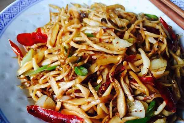 1、杏鮑菇、青椒、胡蘿卜、水發木耳洗凈切絲,蒜壓扁切碎,薑切碎粒。炒鍋內下少許油,下蔥薑爆香,再下泡椒、豆瓣醬炒出紅油。下胡蘿卜絲翻炒。