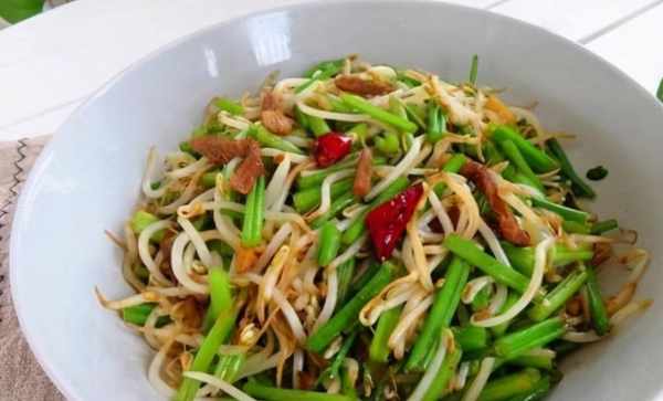 用料:綠豆芽300克,芹菜2棵,五花肉50克,花生油3勺,蔥1段,薑1小塊,蒜2瓣,幹辣椒2個,黃豆醬2勺,鹽少半勺