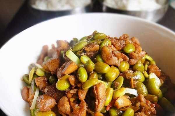 做法1.毛豆去皮留豆;雞胸肉切丁撒入鹽;倒入適量料酒;