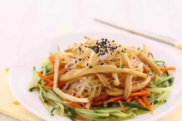 材料:黃花菜50克、粉絲1小把、黃瓜半根、胡蘿卜半根、鹽1/2茶匙、醬油1茶匙、芝麻油1茶匙、白醋1.5茶匙
