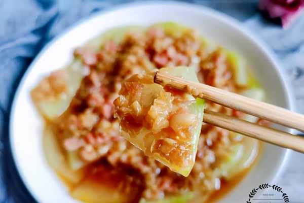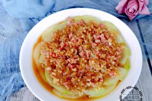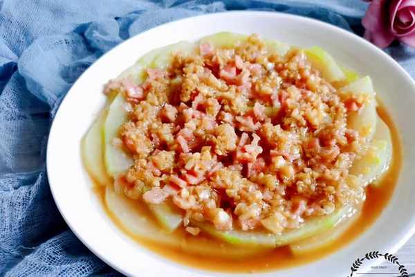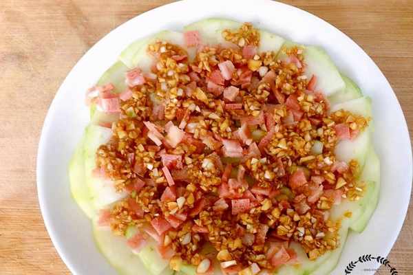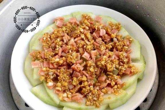 1、處理冬瓜和培根。將冬瓜去皮去籽後洗凈,用刀切薄片,培根解凍後切成碎丁,將冬瓜平鋪在盤底,培根碎散在冬瓜片上。