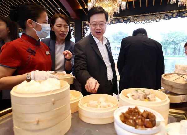 4月21日-24日,香港特區行政長官李傢超率領逾百人的香港特區政府及立法會大灣區訪問團前往粵港澳大灣區內地城市。今日上午,特首李傢超到泮溪酒傢喝早茶,體驗“廣式早茶”,感受“食在廣州”。他發微博、道心聲: