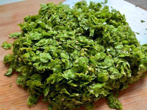 4.浸泡好的榆錢控水取出,擠掉多餘的水分,然後放入菜板上,用刀輕輕剁細,榆錢剁得越細,沾液就會越多,包出的餃子吃起來就會越滑嫩,如果不喜歡吃太滑嫩的餡,就稍微剁一下,喜歡吃的就多剁一會兒。