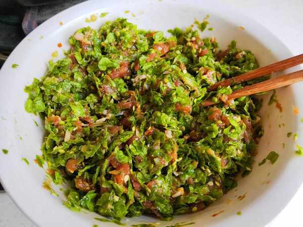 5.最後,將剁好的榆錢放入到醃制入味的肉餡內,先加入兩勺植物油攪拌均勻,鎖住榆錢的水分和營養,另外,可以防止包餃子時出水,接著再加入一勺食鹽,繼續充分攪勻就可以瞭,鮮美多汁的榆錢肉餃子餡就調好瞭,真的是超好吃!